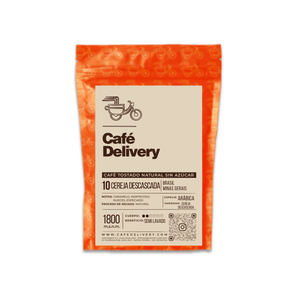 Este café proviene de Minas Gerais, Brasil. Es de especie Arábica y variedad Cereja Descascada. Procesado con beneficio semi lavado. En taza se perciben notas a caramelo, mantecoso, nueces y especias. Perfil: acidez media, cuerpo medio, intensidad media alta. Cultivado a una altitud de 1800 m.